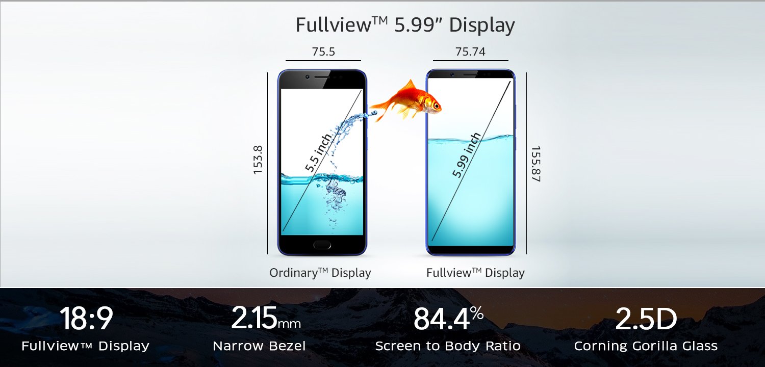 • 15.21 centimeters (5.99-inch) fullview IPS capacitive touchscreen with 1440 x 720 pixels resolution and 268.8 ppi pixel density