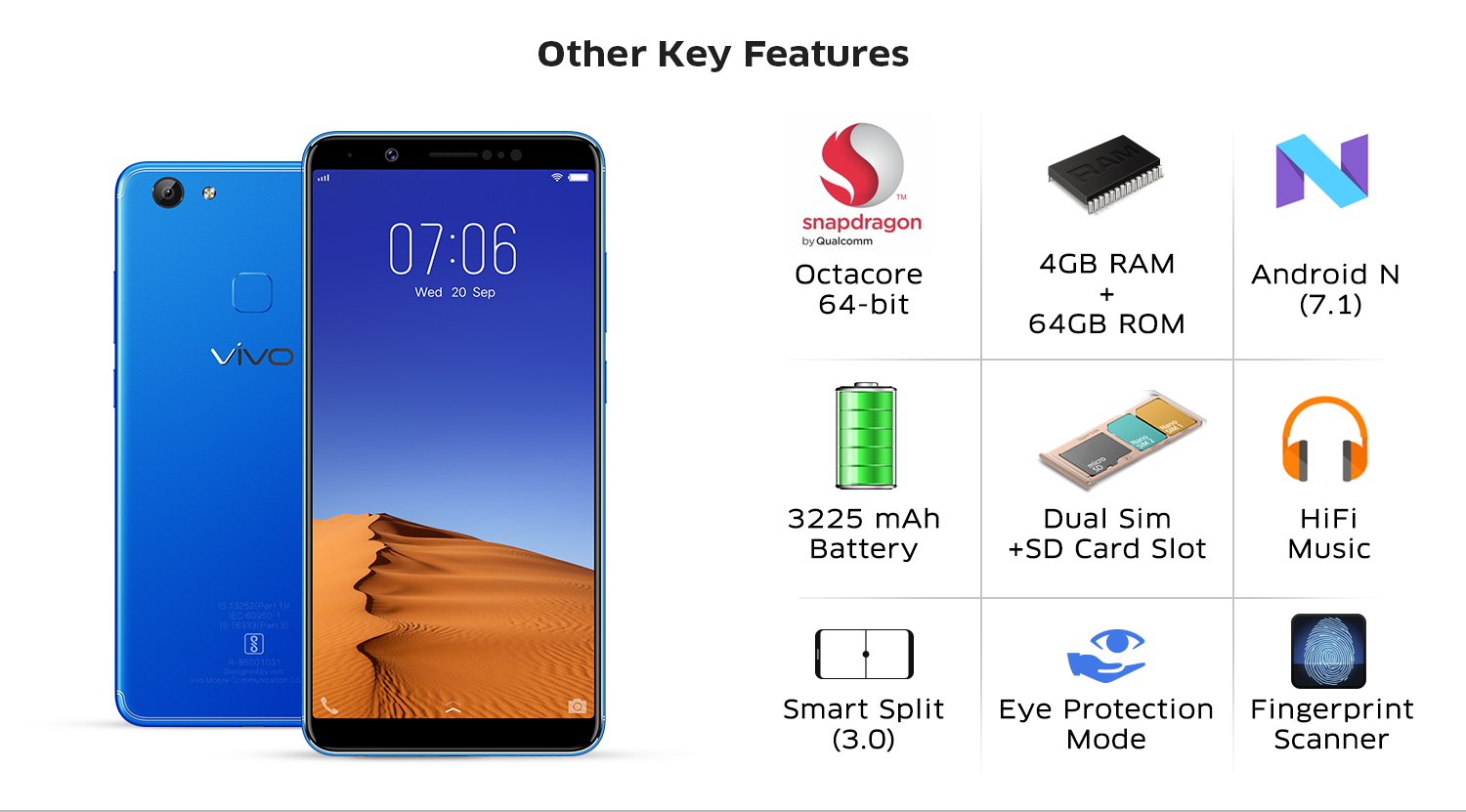This smartphone runs on Qualcomm Snapdragon 450 processor. This processor improves the overall user experience of the phone. It is based on the Android 7.1.2 Nougat operating system, which again has multiple features that improve the overall user experience. Vivo has added their own FunTouch 3.2 OS to the Android OS and improved the user experience of the device.