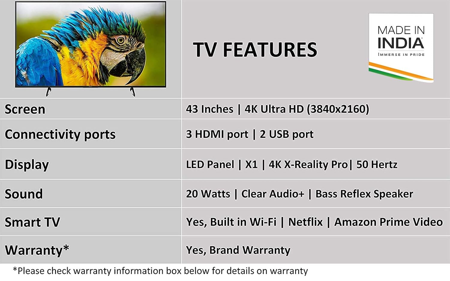 4. sony Bravia 1 year comprehensive warranty by Sony from date of purchase.